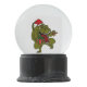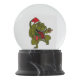 Un dessin d'une bande dessinée T-rex utilisant un casquette du père noël et tenant des présents dans lui est des mains.