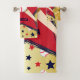 Les battes de baseball, la boule et les sports personnalisés d'étoiles conçoivent comporter deux battes de baseball croisées avec un base-ball au milieu sur grande une étoile rouge et bleue. L'arrière - plan a un motif des étoiles rouges, blanches et bleues et des base-ball sur un arrière - plan d'or. Ces produits sont entièrement personnalisables avec un nom de votre choix pour créer un cadeau unique de base-ball.