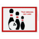 Boule de bowling et épingles carte de voeux horizontale qui présente une icône minimaliste de trois épingles de bowling noir avec des bandes rouges, une balle et votre texte sur un arrière - plan blanc avec une bordure rouge.