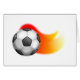 Illustration colorée d'un ballon de football volant à travers l'air avec une trace de chaleur ou de flammes de feu laissée dans son sillage. Image disponible sur divers cadeaux et produits.