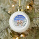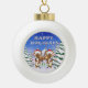 Happy Holiday's Mice Ceramic Ball Ornaments dispose d'un arrière - plan de scène de neige avec la neige tombée, des pins enneigés, un chalet enneigé, deux souris brunes joyeuses tenant leurs sucres de canne entrelacés avec des ornements sur eux. Le texte du cookie de Noël bleu gelé est Joyeux Fêtes. Boule en céramique avec trois choix de design sur le dos (arbre de Noël, cloche, Poinsettia); ornée d'un cintre en or et d'une corde dorée. Cadeau de Noël pour gardien parfait! Cette conception a été créée à l'aide de artwork©delightful-doodles.com (http://delightful-doodles.com/) original