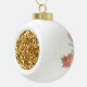 Ce traditionnel ornement de boule de Noël a une image de parties scintillant ronde du centre avant en or. À l'arrière de l'ornement du ballon a une image de poinsettias rouges entrelacées de cloches dorées. Customisez cet objet avec ce modèle ou achetez comme indiqué. Ornement de bal en blanc seulement. Image sous licence