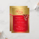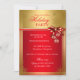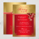 Invitation de fête de Noël Rouge Or. Ruban élégant et boule avec flocons de neige dorés.
