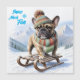 Bouledogue français faisant une descente en traîneau dans la neige. Avec un bonnet, une écharpe et des vêtements chauds, la petite balade en montagne commence pour le petit chien. Enfin de la neige à Noël, le petit Frenchie est ravi.