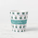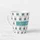 Fils de tricot et aiguilles tasse motif avec endroit pour personnaliser avec un nom. L'exemple de texte est "{Name} tricot mug" dans le script blanc sur le panneau bleu-vert de la mer au centre d'une tasse blanche. Deux aiguilles de tricot collées dans une boule de fil bleu varié font un motif amusant autour de la petite tasse pour le café ou le thé.