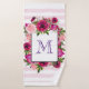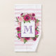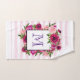 Serviette de bain monogrammée sertie d'un bouquet floral composé de roses rose clair et de pavots rose foncé avec beaucoup de feuilles verdoyants. Un cadre superposé pour placer votre lettre monogramme personnalisée à l'intérieur. L'arrière - plan est une douce motif rayée rose pastel.