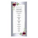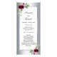 Un programme de mariage élégant et bohème, de style boho. Plumes d'eau, roses, fleurs en bordeaux. Modèles pour vos noms, dates, détails de la cérémonie et de la fête. Un cadre faux argent et blanc et un arrière - plan chic et glamour faux argent, des lettres de couleur noire.