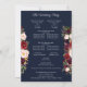 Un beau programme de mariage pour un beau mariage. Décoré de fleurs de pivoines roses et bordeaux, ce programme de cérémonie mariage de fleurs de marsala rose et bordeaux ajoutera des détails élégants ou modernes à votre journée spéciale. Disponible avec un arrière - plan blanc, rose, noir, bordeaux (marron) et bordeaux foncé. Voir notre collection Marsala Bourgogne pour toutes les couleurs. avec un arrière - plan de marine.