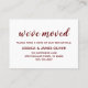 Gardez vos amis et votre famille à jour avec votre nouvelle adresse en utilisant ces cartes d'enceinte simples et élégantes. Des notes polyvalentes lisent "nous avons bougé" à l'avant et "restez en contact !" à l'arrière, en utilisant une police de caractères manuscrite moderne, audacieuse. Utilisez les champs modèle pour ajouter tous vos propres détails afin de customiser ce design pour votre usage personnel. Le texte de cette version a été réglé sur un rouge bordeaux foncé sur blanc. Toutes les polices et les couleurs peuvent être changées à votre gré, si le style vert et blanc veut être changé un peu selon vos goûts. Faites ces cartes vous-mêmes !