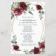 Le design présente un cadre géométrique imprimé de couleur or avec des éléments floraux dans les tons bordeaux, rouge et rougissant sur la verdure, l'eucalyptus et les fleurs.