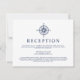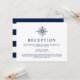Cartes d'invitation à la réception sur le thème nautique avec une rose des vents de style vintage et un fond rayé bleu marine et blanc au verso.