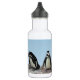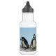 Cette bouteille d'eau présente des pingouins africains debout sur une corniche rocheuse devant un ciel bleu. Ce sont des oiseaux aquatiques sans vol dont les ailes sont devenues des palmes. Chacune a une bande noire et des taches noires sur la poitrine. Le motif de taches est unique pour chaque pingouin, tout comme les empreintes digitales humaines. Ils ont des glandes roses au-dessus des yeux et des pieds roses et noirs.