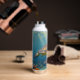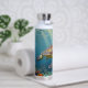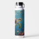 A sea turtle themed personalized water bottle with an illustration of a sea turtle under a calm teal sea swimming among the coral on the ocean floor with sun rays beaming down on him through the aqua water.
