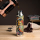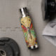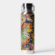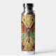 A pretty water bottle with an illustration of a beautiful gold, teal and orange butterfly surrounded by yellow, white and purple flowers. It's done with an impasto style and just emanates beauty and grace.