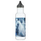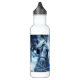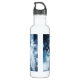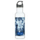 Bouteille d'eau avec une photo d'une paire de chevaux coincés ensemble. Un jour enneigé et un filtre bleu créent une scène magique.