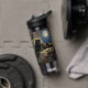 A black panther themed personalized water bottle. On the front is an illustration of a majestic black panther with fur like molten black and gold, laying on a cliff ledge bathed in ethereal moonlight. Intricate carvings adorn crumbling stone pillars, and bioluminescent flora casts a soft, otherworldly glow. The scene is rendered in a rich, textural oil painting style with thick, .