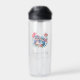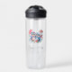 Bouteille d'eau avec l'image d'une paire de chouettes amoureuses assis ensemble sur une branche d'arbre. Entouré de jolies fleurs bleues, vertes et roses.