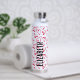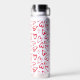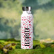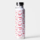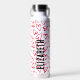 Les coeurs rouges dessinés à la main couvrent cette bouteille d'eau personnalisée avec votre nom imprimé verticalement en lettres chic.