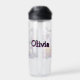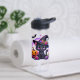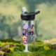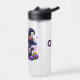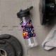 Une adorable bouteille d'eau d'Halloween personnalisée qui présente un mignon chat noir dans un casquette de sorcière avec un citrouille. chauve-souris et éléments mignons violet et orange. Beaucoup d'éléments noirs, violets et oranges.