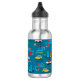 Cute Planes Bateaux Voitures Enfants Garçons Nom personnalisé Water Bottle présente des illustrations de bateaux, avions, cartes, hélicoptères et bâtiments en bleu, jaune, rouge, blanc, vert et noir sur un arrière - plan bleu. Personnalisé avec votre nom en modifiant le texte dans la zone de texte fournie. Parfait pour un petit garçon ou un bébé.