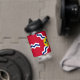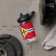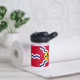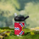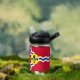 Bouteille d'eau avec drapeau de la ville de Saint-Louis; drapeau rouge avec vagues blanches et bleues et fleur de lys bleu en cercle jaune