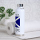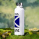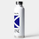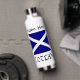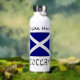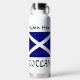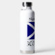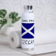 Une bouteille d'eau personnalisée montre le drapeau de l'Ecosse, ou, St. Andrew's Cross, et le mot, SCOTLAND ci-dessous en lettres noires vieilles police de type anglais. Au-dessus du drapeau se trouve un endroit à personnaliser avec un nom pour un cadeau ou pour vous-même.