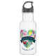Une bouteille d'eau avec vos informations mariage personnalisées. Un coeur charmant rempli de fleurs tropicales et de feuilles aux couleurs rose, vert et jaune. Design estival et fantaisiste.