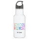 Bouteille d'eau personnalisée de typographie d'arc-en-ciel d'infirmière d'école. Lettres d'arc-en-ciel de texture d'aquarelle orthographiant l'INFIRMIÈRE d'ÉCOLE. Personnalisé avec l'école, le nom ou toute autre information. Cadeau d'amusement pour votre infirmière préférée d'école. Typographie colorée et moderne.