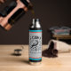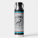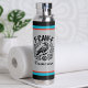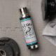 This monogrammed water bottle features a funny raven, or some people might think crow, that has had it with the world. He's telling everyone to F-CAW-F, to essentially go away and leave him alone. This classic crow is surrounded with a wreath of leaves and flowers. If you like dark humor, or are an introvert who likes their alone time without being bothered, this dark humor bird might send the right message or make your friends laugh. The crow and text are in black against a light gray background with black, turquoise, and deep orange trim at the top and bottom of the design.
