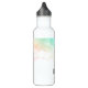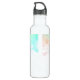 Bouteille d'eau avec une bordure abstraite le long du dessus avec des couleurs tourbillonnant vertes et bleues. Un design doux et estival. Une texture de papier aquarelle claire derrière l'image.