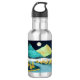 Un magnifique paysage avec des textures uniques montrant un paysage de rivière et de montagne avec une lune montante et ciel étoilé dans les tons de bleu, or, vert foncé et jaune.