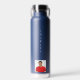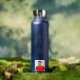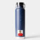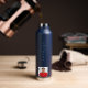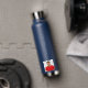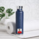 Texte blanc imprimé sur une bouteille bleu marine. Personnalisez et ajoutez votre nom et une photo de profil.