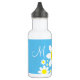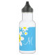 Cette adorable bouteille d'eau comporte des fleurs blanches sur fond bleu et des lettres fantaisies pour la personnalisation.