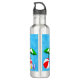Une bouteille d'eau modifiable avec des lettres de script rétro et une plage ou piscine amusante sur le thème des boules de plage rouges, des parasols verts, des sandales de vacances et de l'huile de bronzage sur un arrière - plan bleu ondulé.