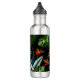 A chic black background. Green and blue tropical rain forest, jungle. Palm tree and banana leaves, foliage with red and orange florals, flowers. A black and orange frame with space for your name and monogram letter. The name is written with a modern hand lettered style script.