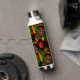 Reggae themed water bottle patterned front and back with a cute Rasta man character, over red, yellow and green stripes. On the front is a monogram diamond area where you can add your own initial