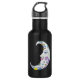 Cette bouteille d'eau a une lune blanche croissant avec un visage avec des lèvres roses et des yeux bleus et des marques abstraites de cercles et triangles bleus et jaunes et un rouleau violet.