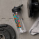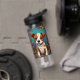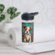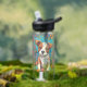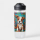 Bouteille personnalisée. Adorable art de l'air blanc avec un chien chiot brun et blanc entouré de fleurs d'art populaire en rose, orange et violet.