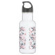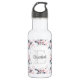 Bouteille d'eau avec un élégant motif fait avec une aquarelle illustration de fleurs roses avec feuilles et tiges bleu-gris. Un cercle blanc superposé avec votre nom et votre monogramme initial à l'intérieur.