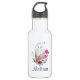 Une bouteille d'eau personnalisée avec un joli tableau aquarelle d'un oeuf vert pâle assis à l'intérieur d'un panier d'osier. Décoré de rubans, arcs, fleurs et petits coeurs. Flamingo rose et lapin lapin blanc à côté.