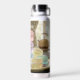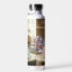 A super sweet personalized water bottle with a fun illustration of translucent macaron cookies in pink, teal, yellow and blue on a plate in a cute kitchen.