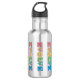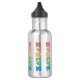 Bouteille d'eau promouvant la paix. Le design est fait de lettres colorées qui épellent évoluer avec la lettre O remplacée par un symbole de paix rond. Ces bouteilles sont décoratives et vous aident à promouvoir la paix et à passer de la haine et des guerres à la paix autour de nous et dans le monde dans son ensemble.