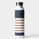 Un motif simple rayé aux accents de pois. Cette bouteille d'eau présente une ligne rouge gras avec une ligne verte plus fine, de chaque côté. Cette combinaison alterne avec une règle noire de cheveux et une bande blanche épaisse. En haut et en bas de ce design il y a un bloc de marine, avec des points dorés.