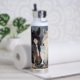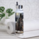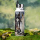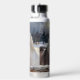 A personalized water bottle with an illustration of two horses on a snowy winter ranch with a full moon in back of them standing behind an old rustic fence.