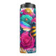 Ce design enchanteur présente plusieurs bourdons aux ailes ondulées et chatoyantes, en arc-en-ciel, bourdonnant au milieu d'une explosion vibrante de roses fuchsia, roses et turquoises. Des structures en nid d'abeille doré et de minuscules coeurs sont disséminés dans l'ensemble, ajoutant un charme fantaisiste. L'art détaillé crée une scène florale animée, colorée et enchanteresse, parfaite pour un tumbler décoratif.