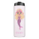 Adorable sirène de dessin animé avec de longs cheveux blonds et roses, de grands yeux bleus, et une queue de sirène rose écailles. Personnalisez avec un nom.
