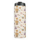 Motif adorable d'un ours lisant des livres avec feuillage boisé et tasses de café sur arrière - plan beige.