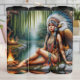 Une femme amérindienne sereine, ornée d'une coiffeuse élaborée à plumes et de bijoux complexes, est assise gracieusement au bord d'une rivière calme. Un majestueux aigle chauve perche à côté d'elle, des ailes légèrement écartées. Un feu de camp chaud brille au premier plan, tandis que des saules luxuriants et des arbres lointains créent un crépuscule paisible et mystique, incarnant l'harmonie avec la nature.
