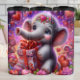 This enchanting digital illustration features an adorable, wide-eyed baby elephant holding a beautifully wrapped Valentine gift box. The elephant is rendered with soft, fuzzy textures and expressive blue eyes, wearing a delicate floral crown adorned with glowing hearts. The surrounding scene is a magical explosion of vibrant purple and pink tones, filled with shimmering stardust, floating hearts, and lush blooming roses. This seamless-style graphic is designed as a full-wrap for insulated tumblers, offering a high-impact, 360-degree visual experience. The whimsical character design and rich, cosmic-inspired color palette make it a perfect gift for Valentine Day, birthdays, or for any animal lover who appreciates a touch of fantasy.