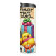Cette illustration humoristique présente un groupe de poussins qui tentent d'envelopper des cadeaux. Un poussin est enveloppé dans du ruban adhésif avec un arc violet, tandis qu'un autre se trouve au sol, épuisé. Sur un panneau au-dessus, on peut lire : "C'EST LA PENSÉE ET LE DUCT TAPE QUI COMPTE...", offrant une présentation drôle et sarcastique sur l'emballage cadeau de vacances.